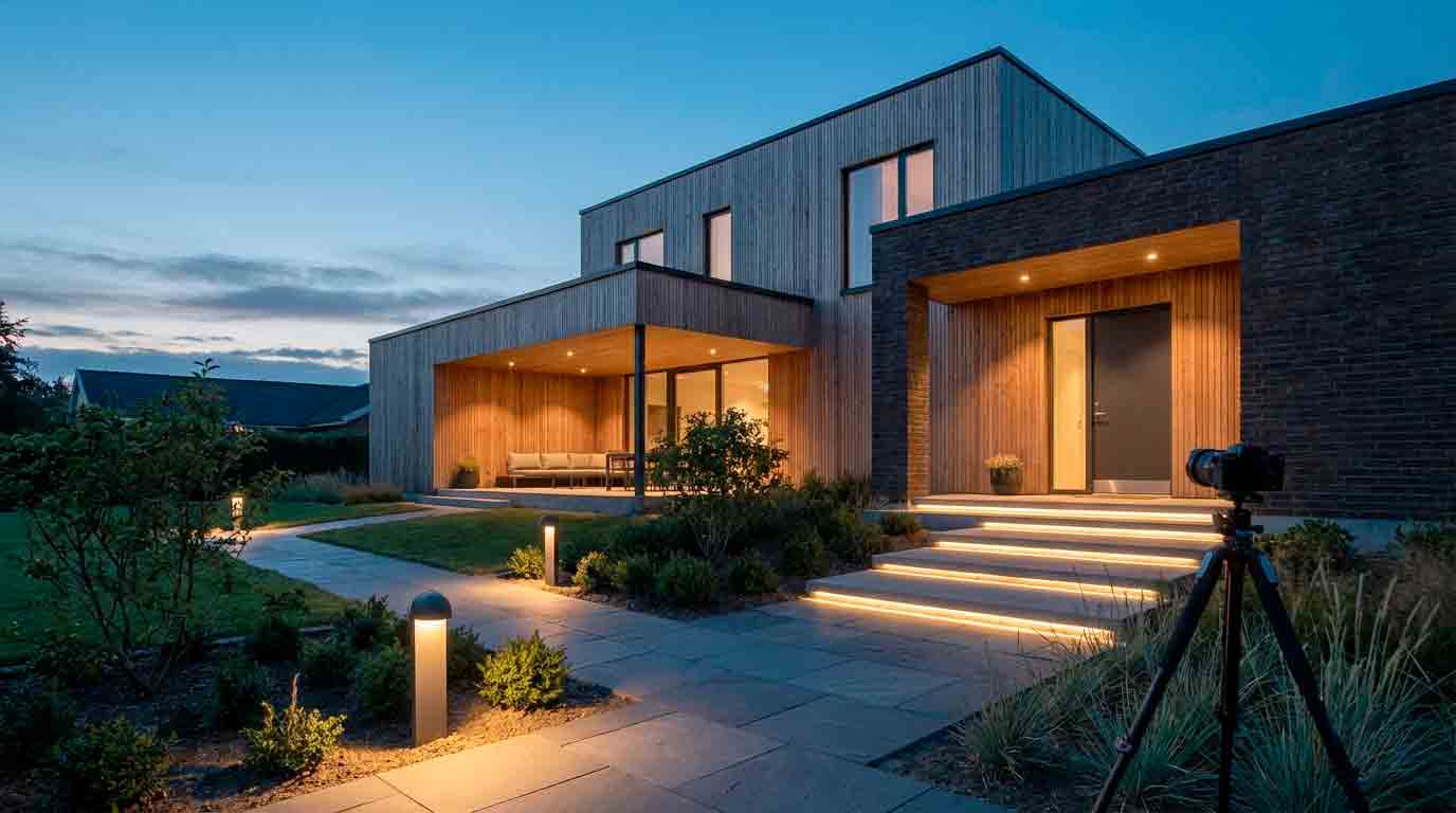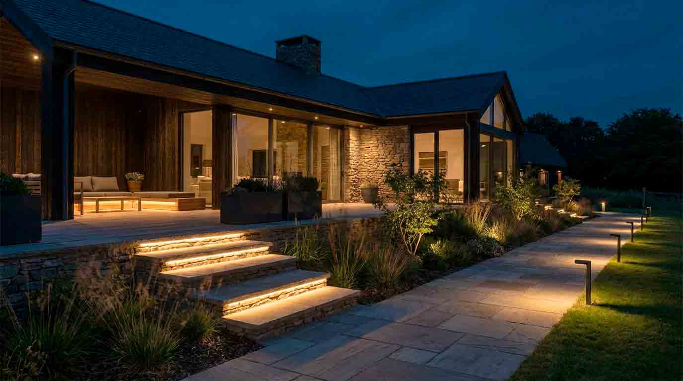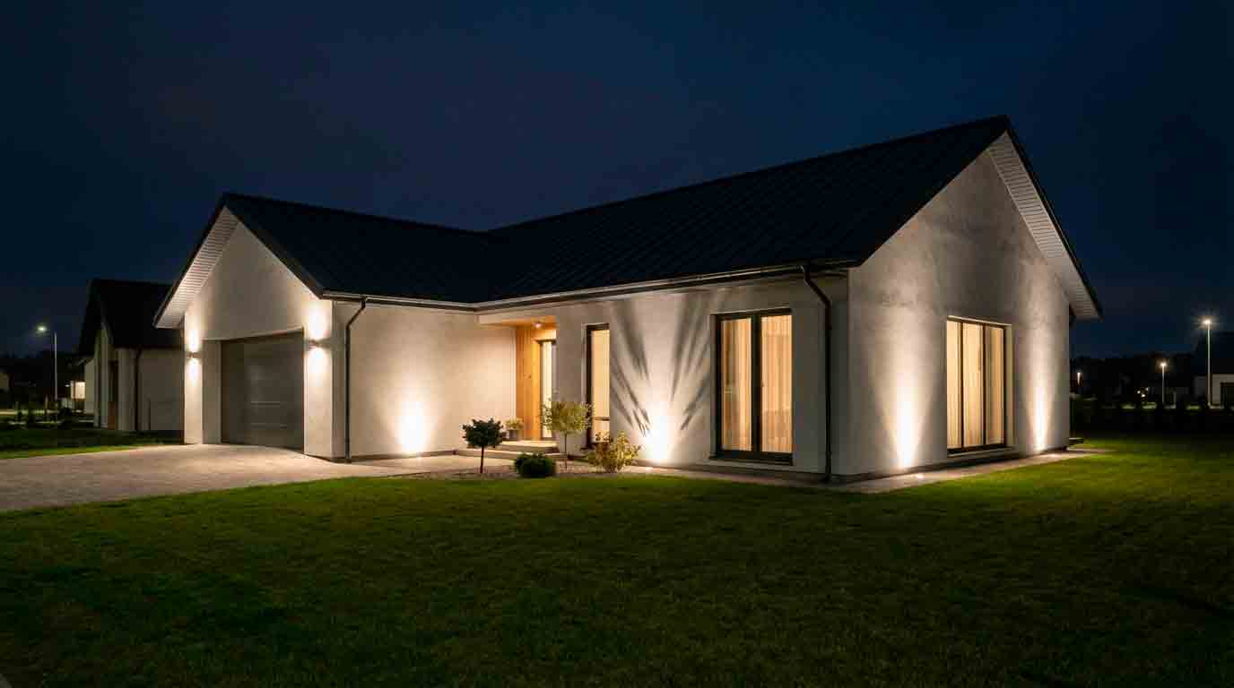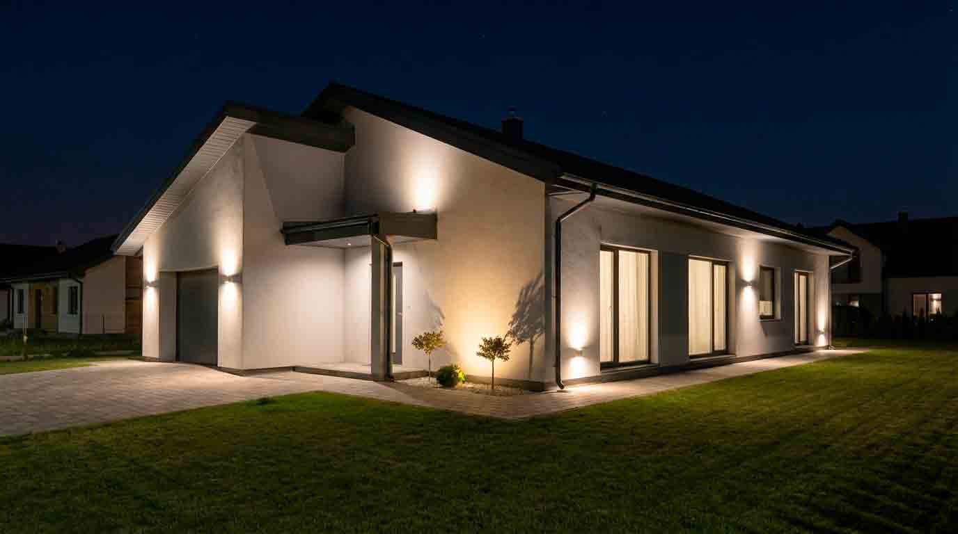 • Vidutinio sklypo sprendimai: zonų išryškinimas uplighting medžiams, judesio jutikliai prie įėjimų, akcentai ant fasado. Daugiafunkcinis išmanus valdymas leidžia lengvai keisti scenas.