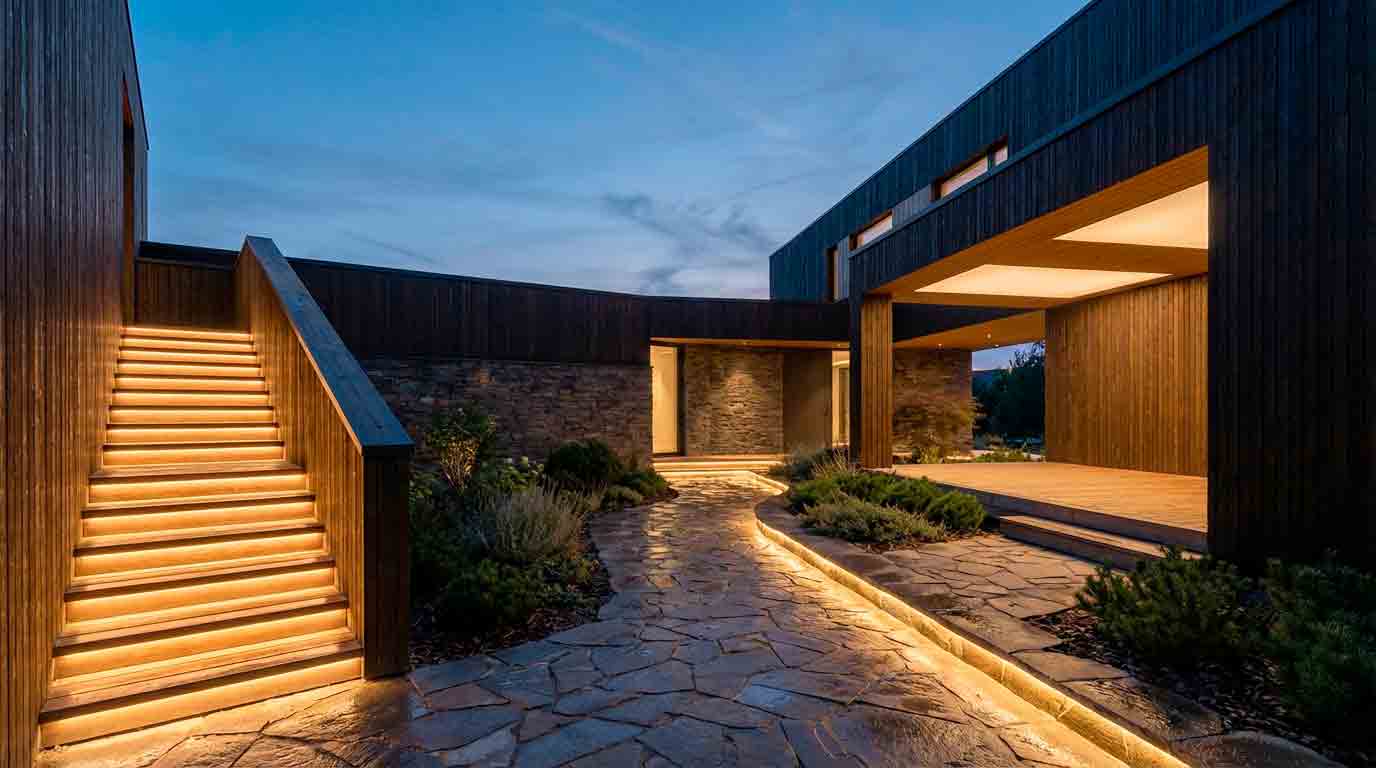 • Mažo sklypo apšvietimas: takas apšviestas žemės prožektoriais, fasadas su bollard LED šviestuvais, terasa su strip juostelėmis ir paprastu išmaniu valdymu. Toks sprendimas saugus ir ekonomiškas.