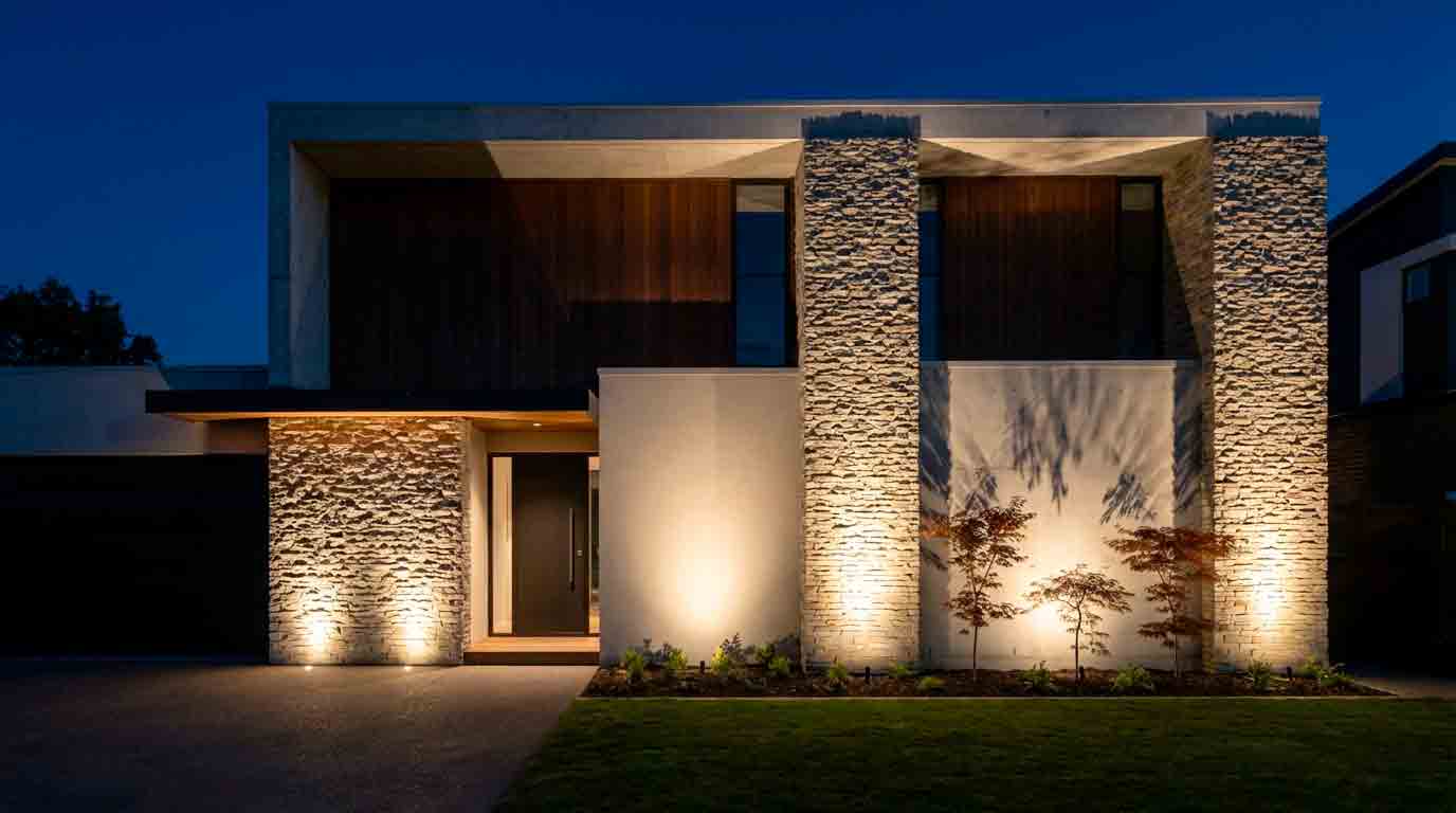 • Wall-wash (lygus apšvietimas): tolygus šviesos pluoštas per visą sienos plotą – tinka modernioms, lygioms fasadų plokštumoms.